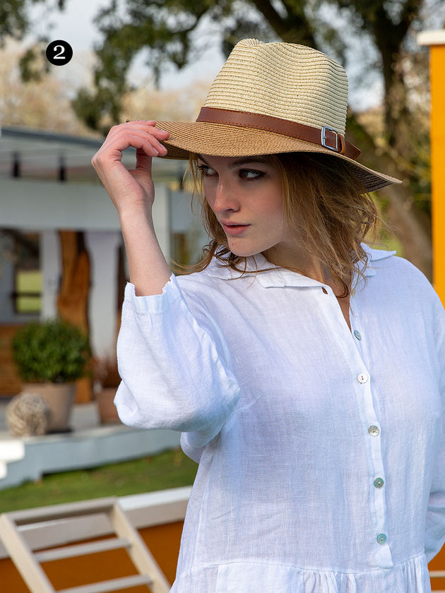 2. Women’s Two-Tone Straw Fedora Hat with Buckle Trim in Natural