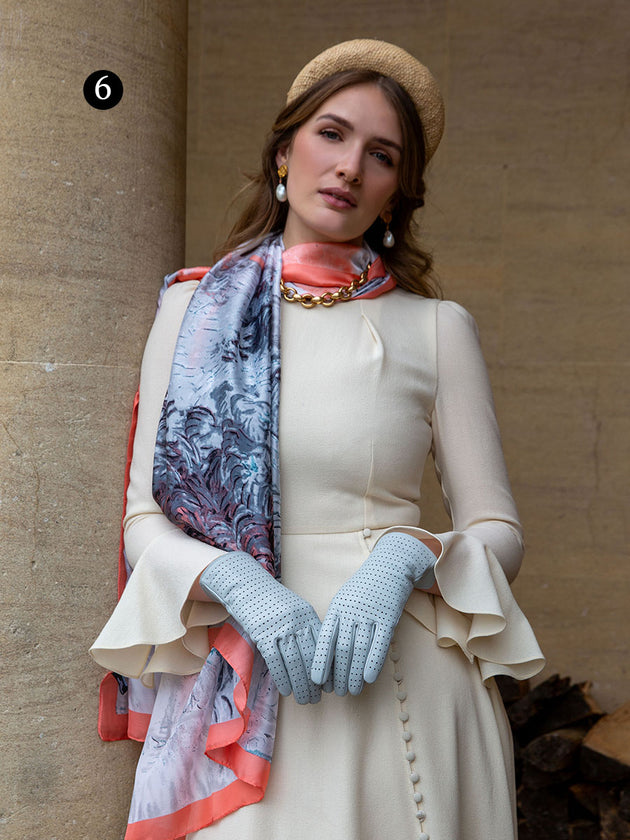 3. Florence, Women's Perforated Leather Gloves in Silver | Women’s Abstract Landscape Print Silk-Like Lightweight Scarf with Border in Coral